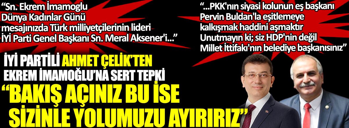 İmamoğlu'nun mesajında İYİ Parti lideri Meral Akşener'i, HDP Eş Başkanı Pervin Buldan ile birlikte etiketlemesini eleştiren Çelik, "Sn. Ekrem İmamoğlu,  Dünya Kadınlar Günü mesajınızda Türk milliyetçilerinin lideri, İYİ Parti Genel Başkanı Sn. Meral Akşener'i, PKK'nın siyasi kolunun eş başkanı Pervin Buldan'la eşitlemeye kalkışmak haddini aşmaktır." diyerek tepkisini gösterdi.