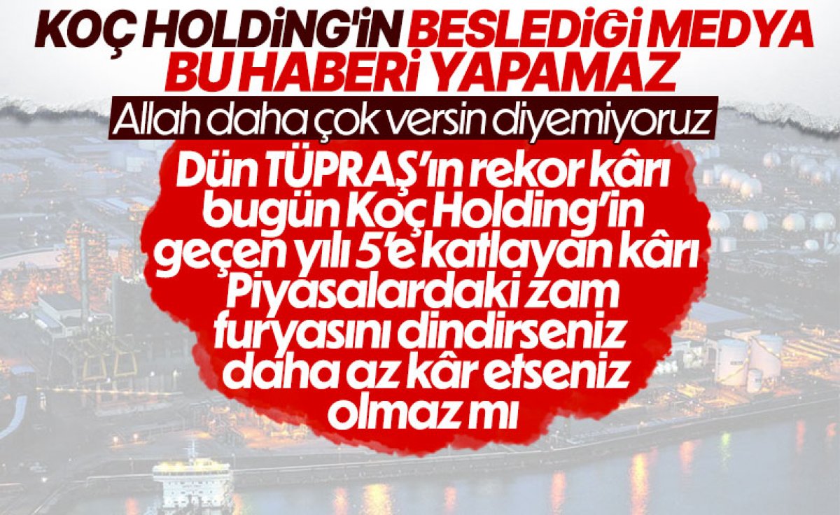 Koç Holding yılın ilk 6 ayı için 22 milyar lira net kâr açıkladı. Artan hayat pahalılığının, yoksulluğumuzun sebebi bu övünerek açıklanan kârlardır.