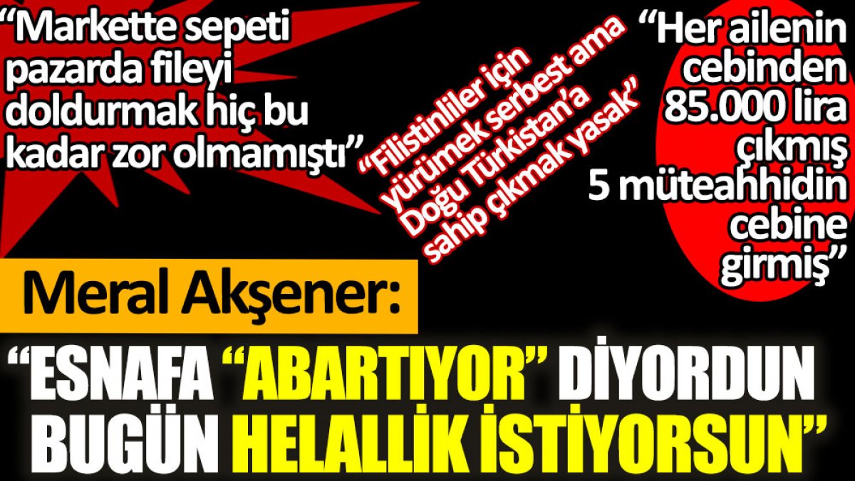 İYİ Parti lideri Akşener, Cumhurbaşkanı Erdoğan'ın, "Sıkıntıya düşen insanlarımız, esnafımız çalışanımız olduysa, hepsinden helallik istiyoruz" sözlerine ilişkin açıklama yaptı. Akşener," Saray'da beslediğin yandaşlardan helallik iste. Daha dün iş yerleri kapanıyor diyenler abartıyor diyordun. Bugün utanmadan helallik istiyorsun" dedi.