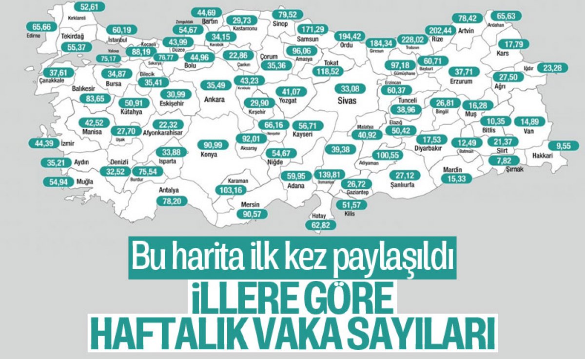 Sağlık Bakanı Fahrettin Koca'nın Twitter hesabından yaptığı paylaşımda, illere göre haftalık vaka sayısı, 100 bin kişilik dilimde belirtildi.