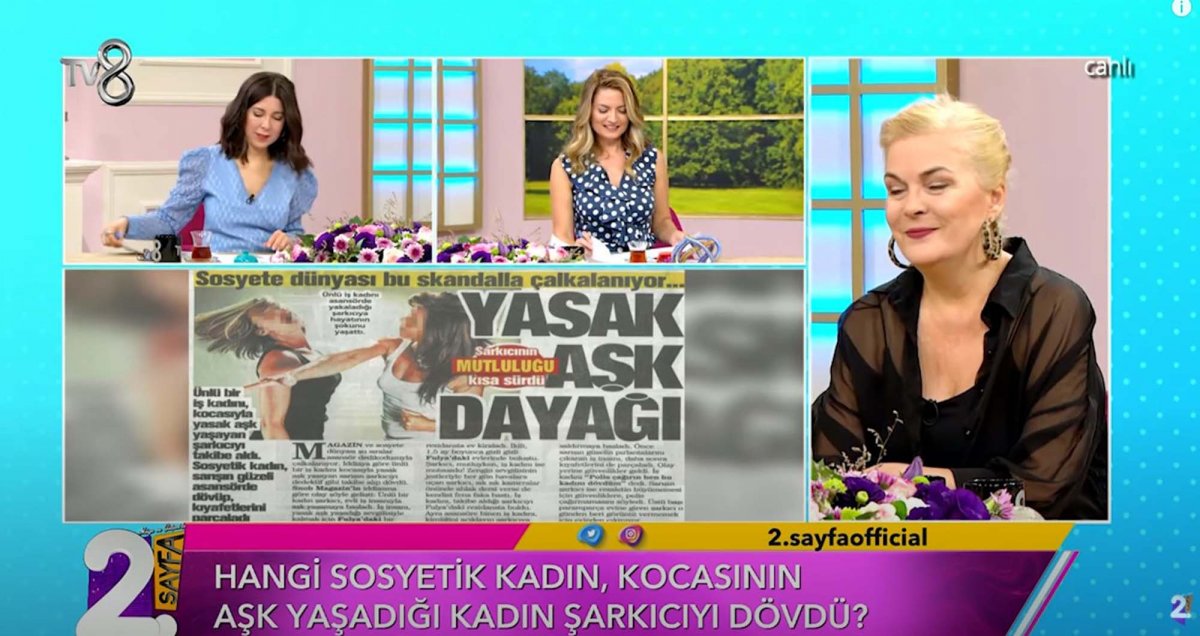 Magazin, ünlü ve sosyete camiası son günlerde ülkenin gündemine oturan bomba iddiayı konuşuyor. Hafta içi her gün TV 8 kanalında ekranlara gelen Müge ve Gülşen'le 2. sayfa programında öyle bir iddia ortaya atıldı ki, yer yerinden oynadı. İddiaya göre ünlü bir iş kadını, kocasının kendisini aldattığı ünlü şarkıcıyı bulup, Fulya'da bulunan rezidance dairesinde tekme tokat dövdü. Programda yasak aşk yaşayan ünlü ismin adı verilmezken, Müge ve Gülşen'in verdiği ipuçları sayesinde o ismin kim olduğu artık tahmin edilebiliyor!